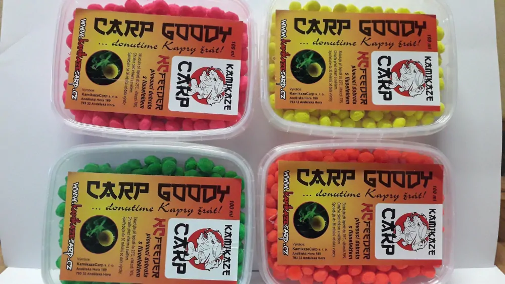 Carp Goody KC je měkká plovoucí fluo nástraha, obalená množstvím chuťových stimulátorů, která po vhození do vody začne uvolňovat atraktanty formou fluo efektu, spolu s barevnou složkou.Nástraha ve vodním sloupci postupně uvolňuje látky s barevným fluo efektem a láká ryby.
